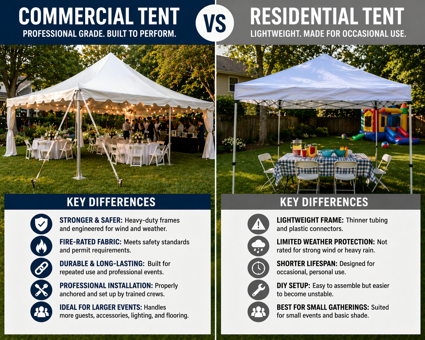 Understanding the side-by-side differences helps clarify why commercial tents are the preferred option for most organized events.